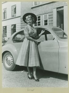 Vintage fashionistas may query Miss Donlan’s couturier – was this a Dior or Jacques Heim* original – or just inspired by them? Her couture echoes the Modernist line – and concept – of her car. Couturiers then and now achieved the effortless elegance of their line with a great deal of costly attention from skilled artisans beneath the surface; and some such as Balenciaga even used a hidden superlight frame to support their masterpieces. Sound familiar?