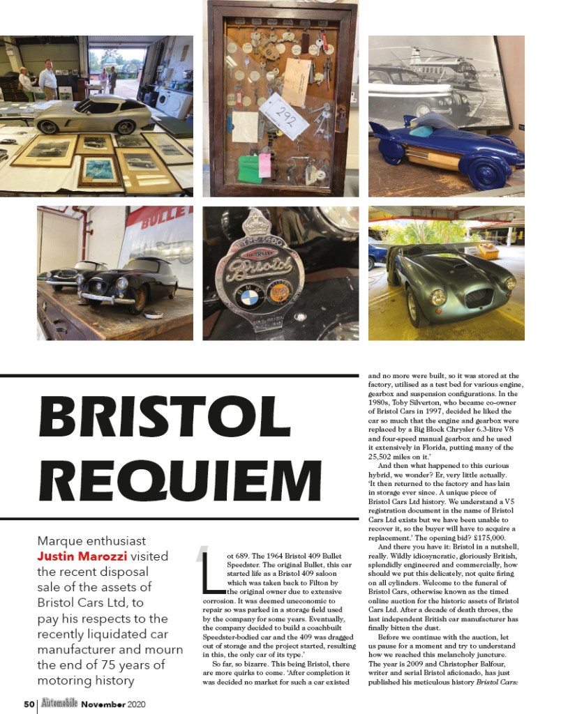 “BRISTOL REQUIEM. Marque enthusiast Justin Marozzi visited the recent disposal sale of the assets of Bristol Cars Ltd, to pay his respects to the recently liquidated car manufacturer and mourn the end of 75 years of motoring history.”