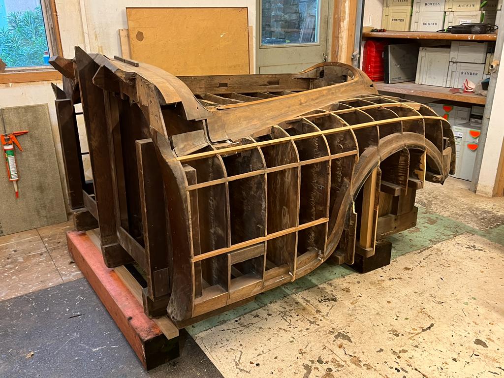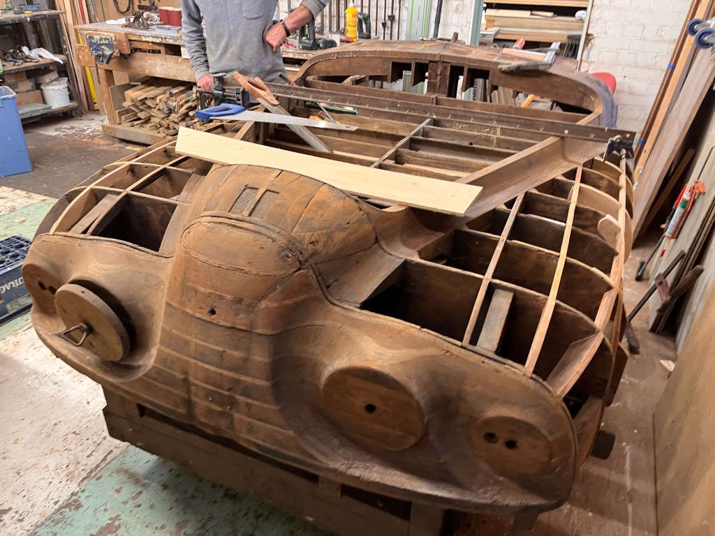 It is made from hardwoods and marine ply. Every aerodyne of this style was made upon it, using the English wheel and incredibly skilled gas welding by the coachbuilders.