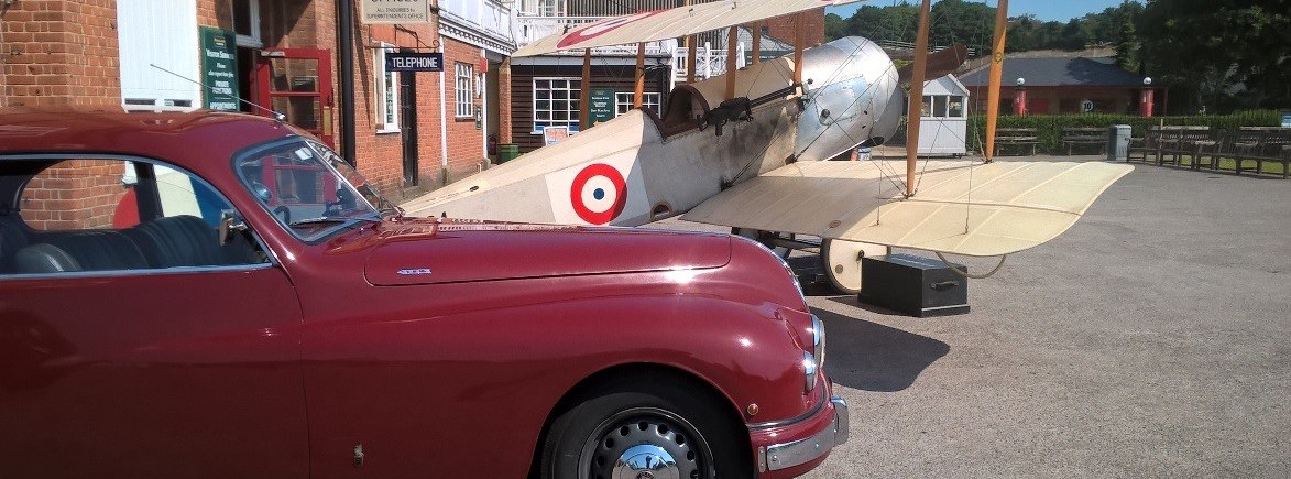 On one Monday in June 2016 I parked my 403 in one corner of the Paddock at Brooklands ( an enclosure reserved for parking of classics only). It was very early so the 403 was the only car in this very big Paddock area. After a while, a 4×4 arrived towing a very large trailer which the driver parked at the opposite corner, well away from the 403. As I watched from inside the Clubhouse, four gentlemen emerged from the 4×4, walked over to the 403 and crowded around the car. They then returned to the trailer, pulled out the parts of a vintage aircraft and started assembling it on the other side of the Paddock. 15 minutes later and the whole thing was done – a magnificent World War 1 bi-plane stood on the tarmac. Then, to my surprise, they pushed the plane up to the 403 and parked it right next to the car. When I went out to talk to them, it all became apparent. The plane was a 1916 Bristol Scout. The owner told me how surprised and delighted they were to find a Bristol car parked there. Photographs were taken of the plane and car together and the owner of the plane showed me around. I was surprised at how crude the construction and controls were – but it worked! The owner then told me the following: the Lewis machine gun bolted to the side of the fuselage fired through the propellor but, unbelievably, was not synchronised. Synchronisation did not arrive until the following year.The result was that bullets hitting the wooden propellor caused splinters to fly back in the slipstream into the pilot’s face. The pilots apparently had developed a trick involving covering the propellors with some sort of cloth to mitigate the problem of splinters.